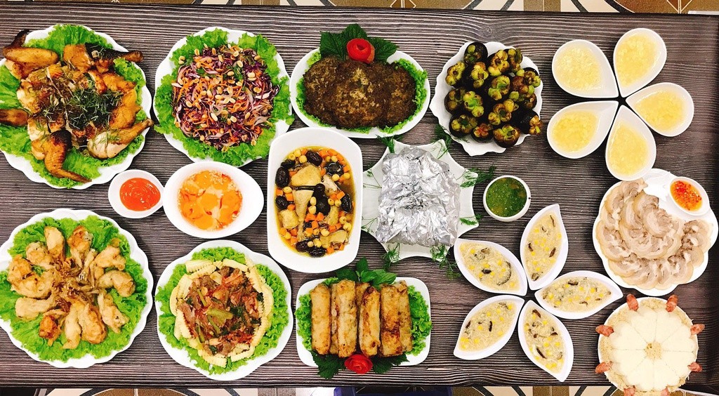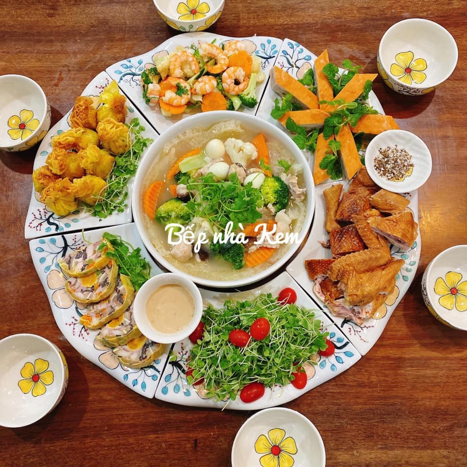 Bên cạnh việc chuẩn bị những món truyền thống, bạn có thể thay đổi công thức và cách trang trí để mâm cơm cúng rằm thêm phần hiện đại, đẹp mắt. Các bà nội trợ có thể tham khảo thực đơn màu sắc gồm các món gà hấp muối tiêu, giò hoa ngũ sắc, canh bóng thả, nem gà, chả quế, tôm xào rau củ và salad rau mầm.
