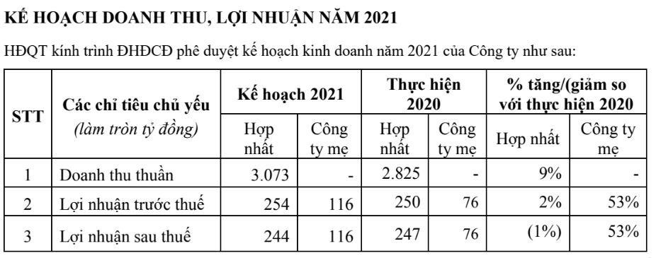 Theo đó, GTNFoods thông qua kế hoạch tài chính năm 2021 với doanh thu là 3.073 tỷ đồng, lợi nhuận trước thuế là 254 tỷ đồng, lần lượt tăng 8,7% và 0,2% so với thực hiện trong năm 2020.