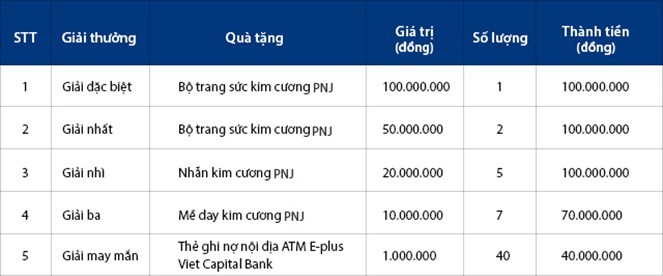 Theo đó, khi khách hàng cá nhân gửi tiết kiệm trong khoảng thời gian khuyến mại với mức tiền gửi tối thiểu chỉ từ 3 triệu đồng, khách hàng sẽ nhận được một mã số dự thưởng và có trong tay cơ hội tham gia quay số trúng những phần thưởng giá trị. Chương trình áp dụng cho các giao dịch gửi tiền kiệm có kỳ hạn từ 1 đến13 tháng, lãnh lãi cuối kỳ. Số lượng số dự thưởng được cấp phát ngẫu nhiên theo bội số của số tiền gửi tương ứng trên sổ tiết kiệm.