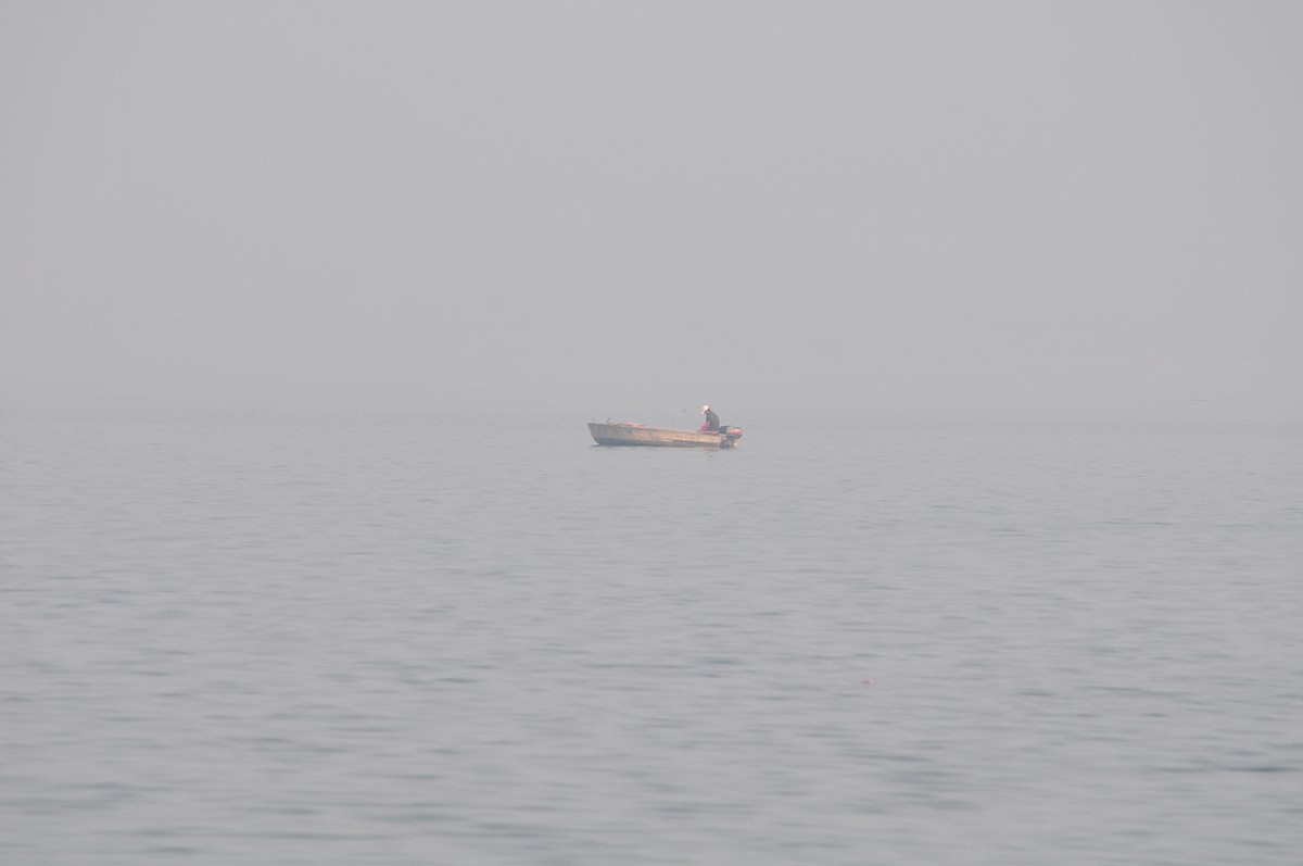 Một chiếc thuyền câu giữa biển sương tại Hồ Tây.