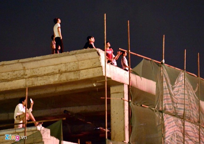...và công nhân xây dựng tại công trình phố Hàng Bài (Hà Nội) xem pháo hoa