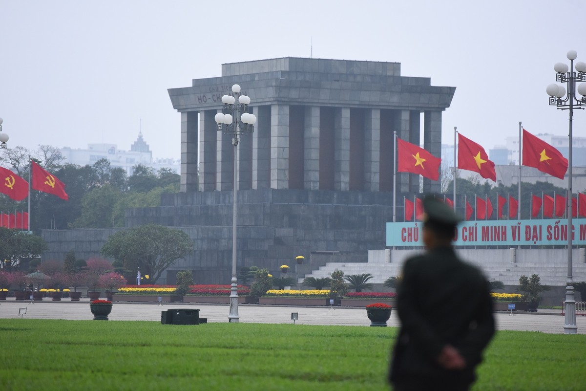 Chiến sỹ an ninh đứng canh khu vực Lăng Bác vào sáng sớm.