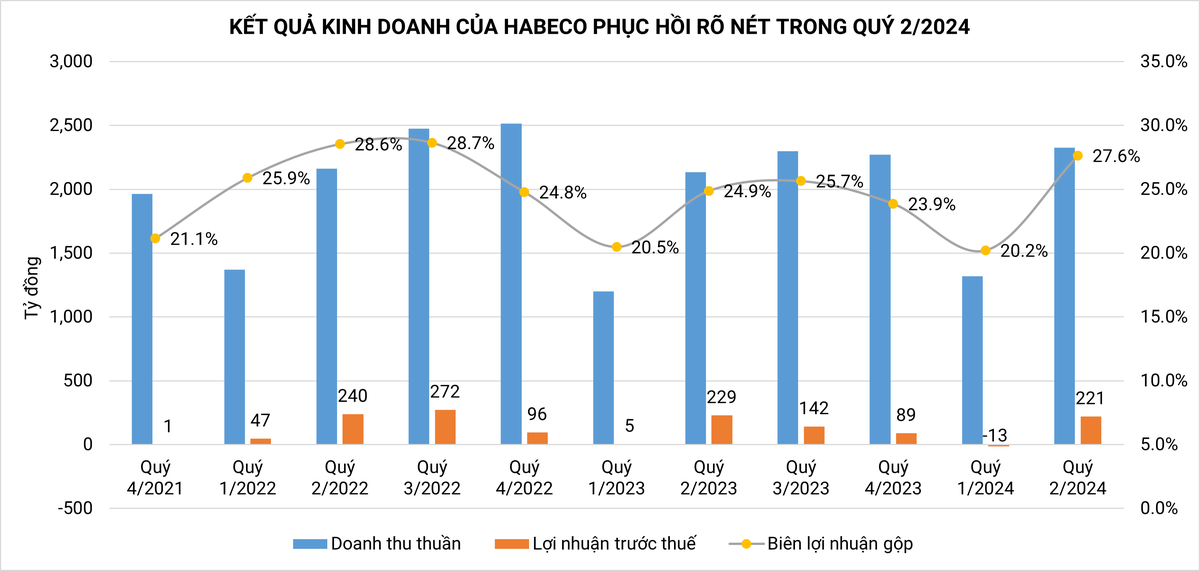 Cụ thể, trong quý II/2024, doanh thu thuần của Tổng công ty tăng trưởng 9,1% so với cùng kỳ năm ngoái, đạt 2.327,8 tỷ đồng. Giá vốn tăng chậm hơn với chỉ 7,4% giúp lợi nhuận gộp đạt 643,5 tỷ đồng, tăng 21% so với quý II/2023. Biên lợi nhuận gộp đạt 27,6%, tăng 2,7 điểm phần trăm so với cùng kỳ năm 2023. Đây cũng là mức doanh thu và biên lợi nhuận gộp cao nhất của Habeco trong 1,5 năm trở lại đây. Lũy kế 6 tháng đầu năm 2024, doanh thu thuần của Habeco đạt 3.647 tỷ đồng, tăng 9,4% so với cùng kỳ năm trước. Lợi nhuận trước thuế đạt 207,8 tỷ đồng.
