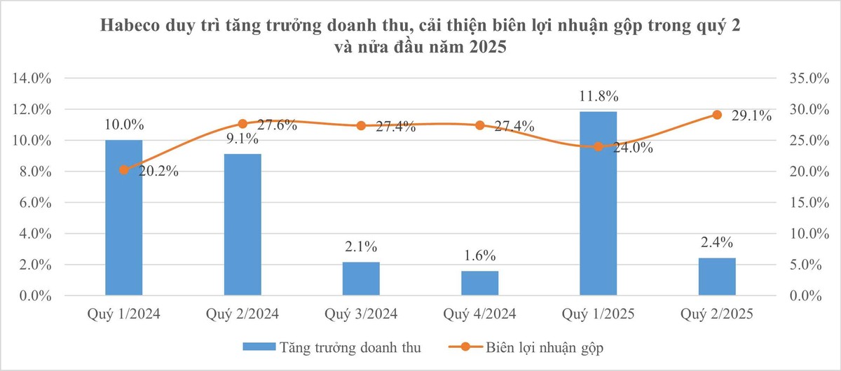 Trong riêng quý II/2025, lợi nhuận gộp hợp nhất của Habeco thu về 694,5 tỷ đồng, biên lợi nhuận gộp đạt 29,1%, ghi nhận mức biên lợi nhuận gộp theo quý cao nhất nhiều năm trở lại đây. Lợi nhuận gộp lũy kế 6 tháng đạt 1.048,6 tỷ đồng, tăng trưởng 15,2% so với quý 2/2024. Biên lợi nhuận gộp nửa đầu năm đạt 27,2%, tăng mạnh so với mức 24,9% cùng kỳ năm 2024.