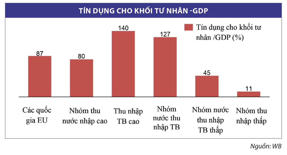 Còn nhóm nước nghèo có tỷ lệ tín dụng cho khối tư nhân/GDP rất thấp, có thể do khối doanh nghiệp nhà nước chiếm chủ đạo trong các thành phần kinh tế, hay các doanh nghiệp tư nhân ở nhóm này chưa quen với vay mượn để mở rộng hoạt động sản xuất - kinh doanh. Liệu đây có phải lý do giải thích cho việc các nền kinh tế này vẫn cứ tụt hậu?