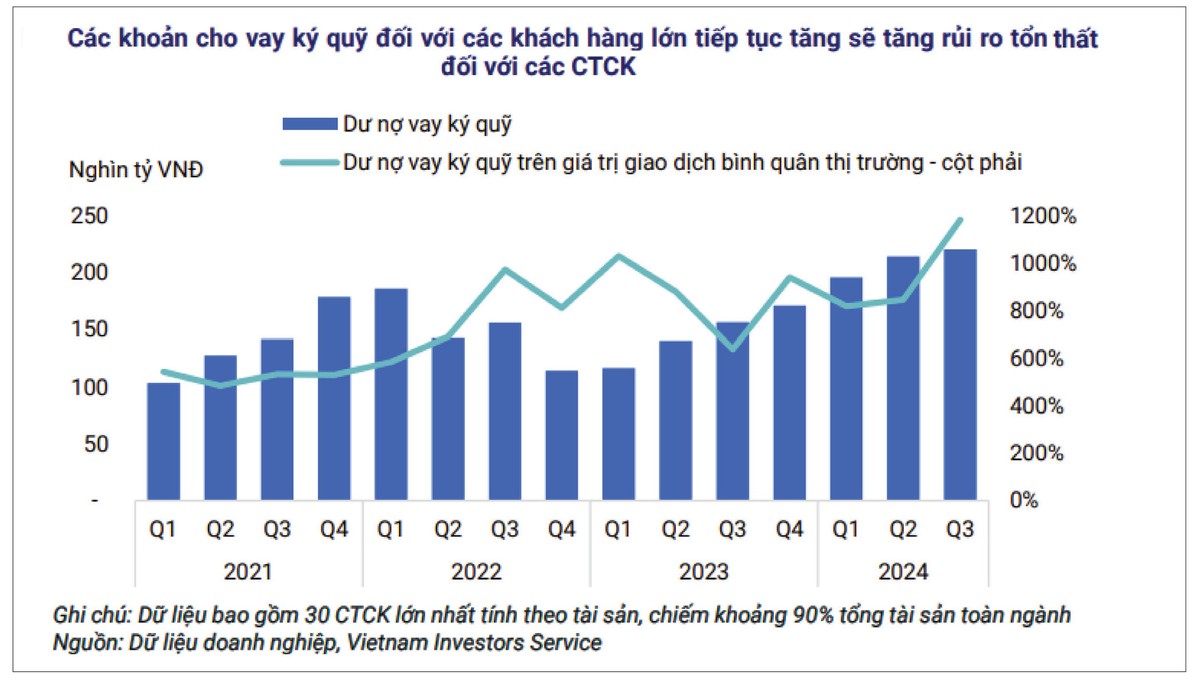 Thống kê của VIS Rating, dựa trên số liệu của 30 công ty chứng khoán có tổng tài sản lớn nhất, cho thấy tỷ lệ dư nợ cho vay ký quỹ/giá trị giao dịch bình quân thị trường đã tăng từ mức 1.000% vào quý I năm nay lên gần 1.200% vào cuối quý III vừa qua.