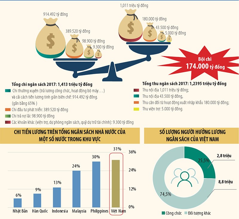 Bộ máy gần 4 triệu người hưởng lương và mang tính chất lương đang trở thành gánh nặng lớn cho đất nước. Năm 2017, tổng thu ngân sách nhà nước ước đạt hơn 1,23 triệu tỷ đồng, nhưng tổng chi ngân sách hết hơn 1,413 triệu tỷ đồng. Trong đó, chi thường xuyên hết 914.492 tỷ đồng, chủ yếu là chi trả lương, phụ cấp, hoạt động… cho bộ máy cán bộ.
