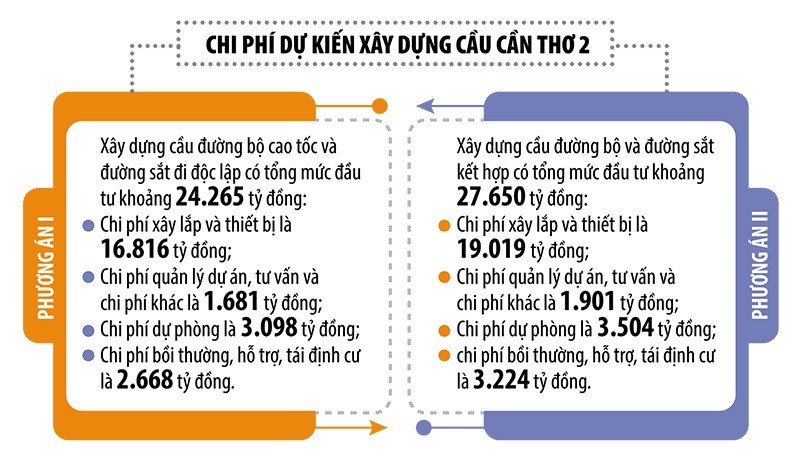 Ước tính, tổng kinh phí xây dựng phương án cầu đường bộ cao tốc và đường sắt đi độc lập là 33.989 tỷ đồng (trong đó riêng cầu đường sắt cần tới 9.724 tỷ đồng), lớn hơn so với phương án cầu đường bộ kết hợp với đường sắt là 6.339 tỷ đồng.
