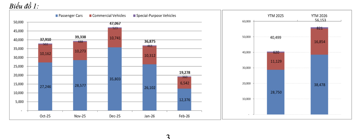 VAMA cho biết, tổng doanh số bán hàng toàn thị trường tính đến hết tháng 2/2026 đều tăng so với cùng kỳ. Cụ thể, xe ô tô du lịch tăng 34%, với tổng 38.478 xe (trong tháng 1 bán được 26.102 xe và tháng 2 bán được 12.376 xe). Xe thương mại tăng 51%, với tổng 16.854 xe, xe chuyên dụng tăng 32% với tổng 821 xe.