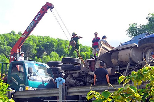 Nhà chức trách điều xe cứu hộ tới cẩu hai xe container. Ảnh: Minh Lý.