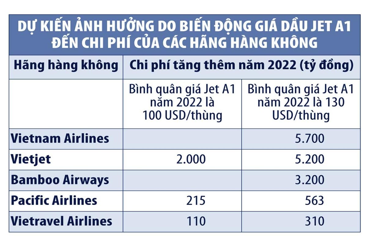 Ông Lê Hồng Hà, Tổng giám đốc Tổng công ty Hàng không Việt Nam (Vietnam Airlines) cho biết, giá Jet A1 trung bình tháng 3/2021 ở mức 130 USD/thùng, khiến chi phí nhiên liệu của Tổng công ty tăng mạnh. Nếu giá nhiên liệu bay duy trì ở mức 130 USD/thùng cho cả năm 2022, thì chi phí của Vietnam Airlines sẽ tăng thêm khoảng 5.700 tỷ đồng. Trong trường hợp, giá Jet A1 tăng lên khoảng 160 USD/thùng, chi phí tăng thêm của Hãng sẽ ở mức 9.100 tỷ đồng trong năm 2022.