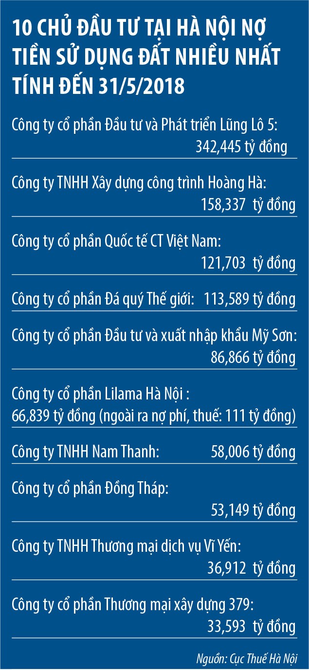 Đặc biệt, Công ty cổ phần Đầu tư và Phát triển Lũng Lô 5, Công ty cổ phần Lilama Hà Nội, Công ty cổ phần Cơ khí và Xây dựng Viglacera... là những doanh nghiệp đã bị Cục Thuế Hà Nội áp dụng các biện pháp cưỡng chế tài khoản, hóa đơn, nhưng vẫn chây ỳ thuế trong một thời gian dài.