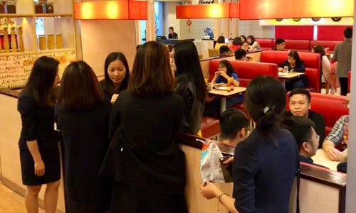 10h sáng, chị Thu Hà – một nhân viên văn phòng ở Cầu Giấy gọi điện tới 5 nhà hàng ở gần cơ quan để đặt bàn cho 6 người đều được trả lời không có chỗ do khách đã đặt hết từ trước. Do đó, 12h trưa nhóm của chị Hà quyết định đến một trung tâm thương mại trên đường Xuân Thủy với hy vọng sẽ có nhà hàng còn bàn trống.