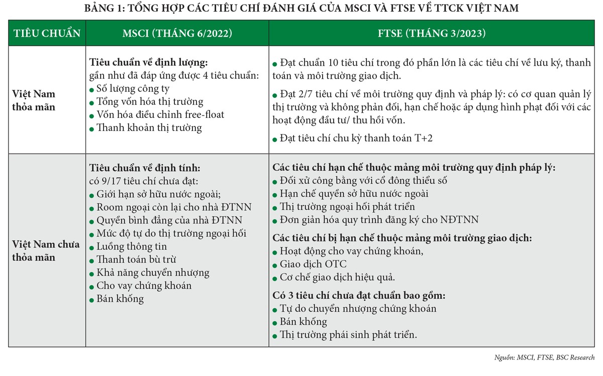 Việt Nam về cơ bản đã đáp ứng được phần lớn các tiêu chí nâng hạng thị trường của FTSE Russell (7/9 tiêu chí) đối với xếp hạng thị trường mới nổi sơ cấp, tuy nhiên đối với tiêu chí nâng hạng của MSCI mới đáp ứng 8/17 tiêu chí - tiêu chuẩn xếp hạng của MSCI khắt khe và không linh hoạt bằng việc phân loại của FTSE Russell.