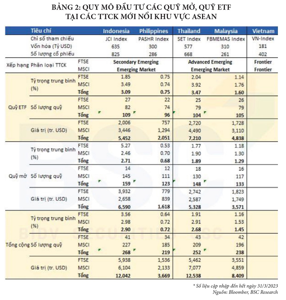 Thứ ba, đón nhận dòng vốn lớn từ các nhà đầu tư nước ngoài. Dòng vốn đầu tư nước ngoài thông qua các quỹ mở, quỹ ETF - tham chiếu theo các bộ chỉ số của MSCI và FTSE được kỳ vọng sẽ “đổ” vào TTCK Việt Nam với quy mô lớn. Theo ước tính của BSC, trong trường hợp nếu MSCI và FTSE nâng hạng Việt Nam lên TTCK mới nổi, sẽ có khoảng 3,5 - 4 tỷ USD mua mới các cổ phiếu Việt Nam. Ước tính dựa trên giả định tỷ trọng các cổ phiếu Việt Nam được mua mới ở mức bình quân khoảng 0,7% - tương đương với tỷ trọng của các cổ phiếu TTCK Philippines (được FTSE xếp hạng TTCK mới nổi sơ cấp) trong các danh mục đầu tư các quỹ hiện tại. (Bảng 2)