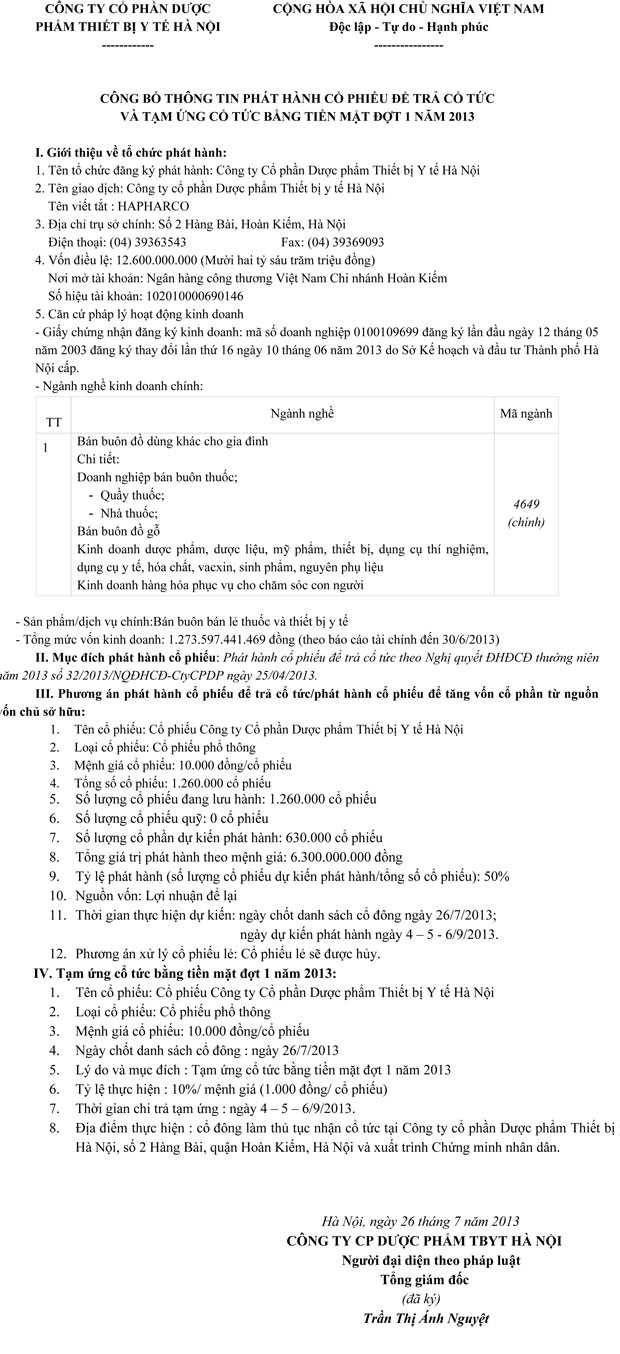 Hapharco: Thông báo phát hành cổ phiếu trả cổ tức