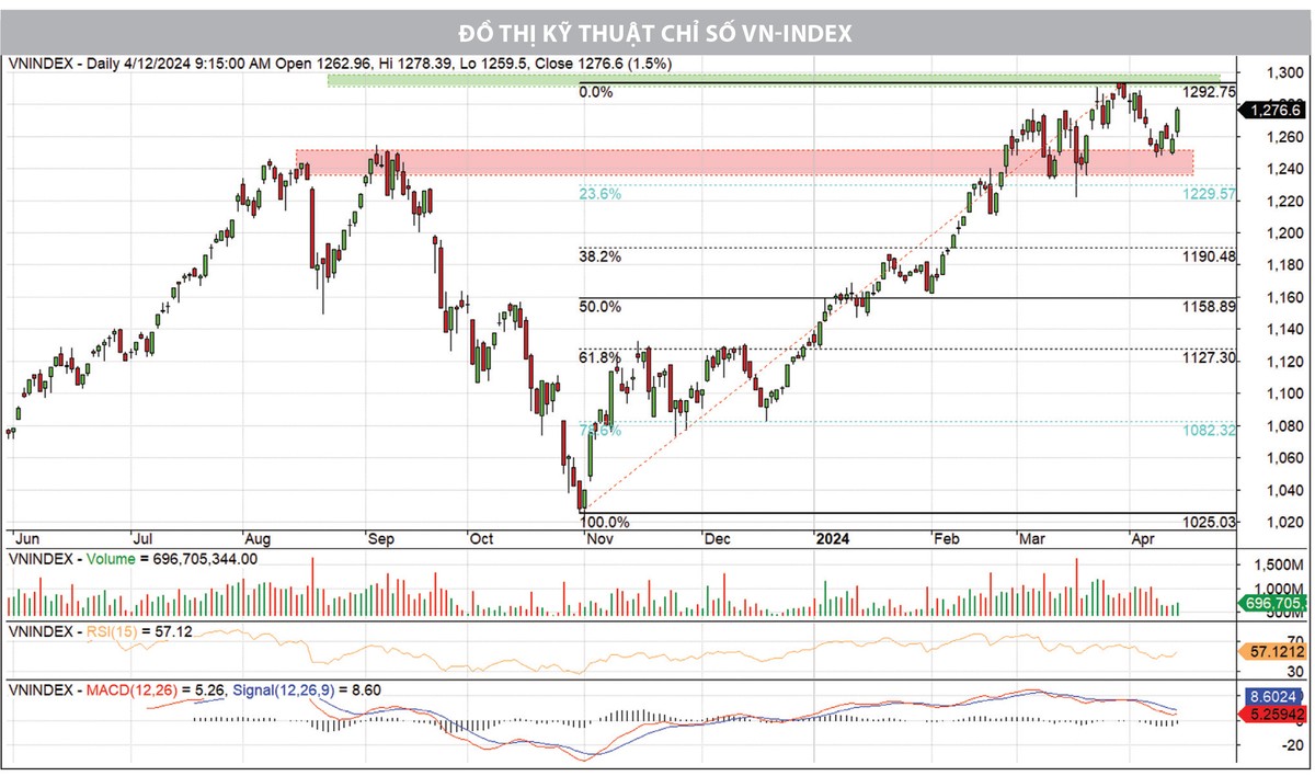 Ngưỡng kháng cự 1.285 điểm - đỉnh ngắn hạn cũ hồi tháng 9/2023 và kháng cự tâm lý tại 1.300 điểm được đánh giá là rất mạnh, đều đang ở phía trên với khoảng cách khá gần, có thể sớm gây áp lực đối với quá trình hồi phục của VN-Index. Khi đó, thanh khoản là yếu tố cần được cải thiện rõ rệt hơn để chỉ số có cơ hội bứt phá khỏi ngưỡng kháng cự.