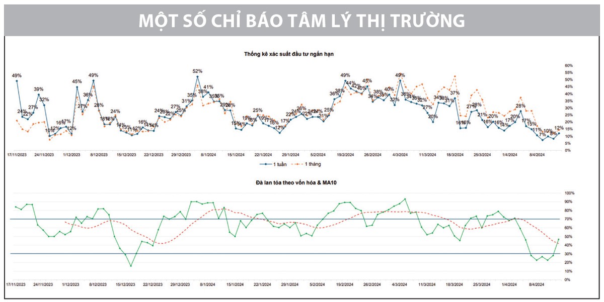 Các chỉ báo tâm lý thị trường cho thấy, dòng tiền vào thị trường bắt đầu được cải thiện. Đường đà lan tỏa ngắn hạn tăng trở lại sau khi điều chỉnh về mức thấp, tạo thành công đáy 2 và vượt lên trở lại trên đường MA10 của chính nó. Điều này được ghi nhận rất rõ khi diễn biến hồi phục tích cực của thị trường trong phiên cuối tuần là nhờ nhóm vốn hóa lớn, đặc biệt là ngân hàng khi bắt đầu xuất hiện thông tin về kết quả kinh doanh quý I/2024. Vận động đó được cho là đúng lúc khi VN-Index trước đó có diễn biến ảm đạm, rung lắc không rõ xu hướng trong biên độ 1.250 - 1.265 điểm. Có thể thấy, vai trò dẫn dắt của nhóm vốn hóa lớn và ngân hàng lại được ghi nhận như một động lực khó thay thế của thị trường. Dù nhóm này “gánh team” trong phiên cuối tuần, nhưng ít nhất cũng giúp tâm lý thị trường được cải thiện và mở ra kỳ vọng sớm đón sóng tăng mới.