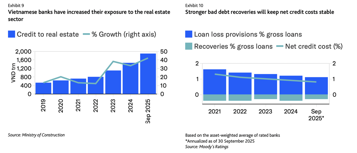 Khi những cải thiện trong lĩnh vực bất động sản dần phát huy hiệu quả, năng lực trả nợ của các chủ đầu tư sẽ được củng cố, từ đó giảm áp lực lên chất lượng tài sản của hệ thống ngân hàng trong bối cảnh mức độ tiếp xúc với lĩnh vực này ngày càng gia tăng. Moody’s cho biết, tính đến ngày 30/9/2025, tăng trưởng tín dụng vào bất động sản đạt 42% so với cùng kỳ năm trước, cao hơn đáng kể so với mức trung bình 27% trong giai đoạn 2022–2024 (Bảng 9). Tổ chức này kỳ vọng mức độ tiếp xúc của ngân hàng với bất động sản sẽ dần ổn định trong năm 2026, sau chỉ đạo của Ngân hàng Nhà nước về việc kiểm soát cho vay vào lĩnh vực này.