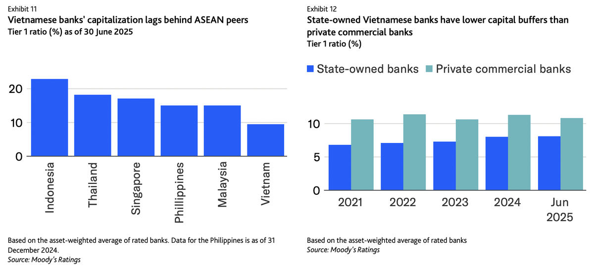 Các ngân hàng quốc doanh lớn như Ngân hàng TMCP Đầu tư và Phát triển Việt Nam (BIDV), Ngân hàng TMCP Công Thương Việt Nam (VietinBank) và Ngân hàng Nông nghiệp và Phát triển Nông thôn Việt Nam (Agribank) - hiện đều được Moody's xếp hạng tín nhiệm ở mức Ba2 cho tiền gửi và tổ chức phát hành, với triển vọng ổn định và mức đánh giá nền tảng tín dụng (BCA) là b1 - sẽ cần đẩy mạnh củng cố bộ đệm vốn do mức vốn hóa còn khiêm tốn so với phần lớn ngân hàng thương mại cổ phần tư nhân (Bảng 12). Trong bối cảnh khả năng tăng vốn từ lợi nhuận giữ lại còn hạn chế, Moody’s cho rằng các ngân hàng này có thể phải tăng vốn thông qua phát hành thêm hoặc từng bước giảm tỷ lệ sở hữu của Nhà nước trong vài năm tới. Một cải cách pháp lý gần đây cho phép các ngân hàng quốc doanh được giữ lại nguồn thu từ việc thoái vốn Nhà nước, qua đó tạo thêm dư địa tăng cường vốn hóa.