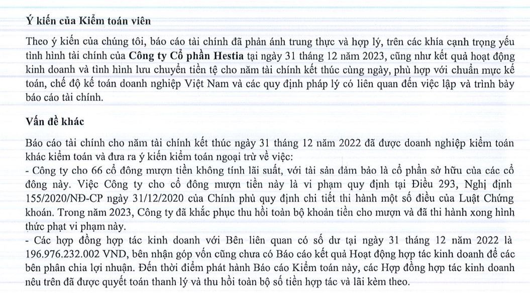 Đồng thời, công ty kiểm toán cũng thông báo về vấn đề ngoại trừ của kiểm toán trong báo cáo tài chính năm 2022 về việc Hestia đã cho 6 cổ đông mượn tiền không lãi suất, với tài sản đảm bảo là cổ phần sở hữu của các cổ đông này. Theo công ty kiểm toán báo cáo tài chính năm 2022, việc Công ty cho cổ đông mượn tiền này là vi phạm quy định tại Điều 293, Nghị định 155/2020/NĐ-CP của Chính phủ quy định chi tiết thi hành một số điều của Luật Chứng khoán. Trong năm 2023, Công ty đã khắc phục thu hồi toàn bộ khoản tiền cho mượn và đã thi hành xong hình thức phạt vi phạm này.