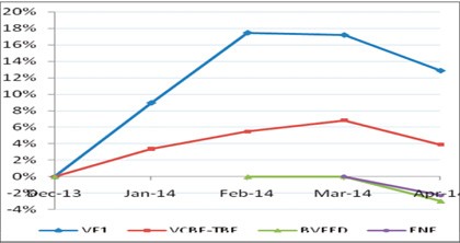Chỉ riêng VF1 của VFM giảm 3,7% trong cùng khoảng thời gian, xấp xỉ mức giảm của VN-Index. Tuy nhiên, nếu tính tăng trưởng trong 4 tháng đầu năm, VF1 lại là quỹ tăng trưởng cao nhất với mức tăng lên đến 12% - cao gấp 3 lần tăng trưởng của VCBF-TBF và cao gần bằng mức tăng của VN-Index.