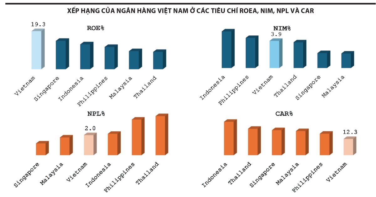 Về NIM, các ngân hàng bán lẻ Indonesia và Philippines đang khai thác các tài sản sinh lời tốt hơn với tỷ lệ trung bình lần lượt là 5,2% và 4,3%, trong khi NIM trung bình của các ngân hàng Việt Nam là 3,9%. NIM trung bình của Malaysia và Singapore ở mức thấp nhất khu vực 2,1%, cho thấy thị trường tài chính của 2 quốc gia này đang ở mức phát triển cao với đa dạng kênh dẫn vốn, đồng thời nhu cầu vốn của nền kinh tế không chỉ phụ thuộc vào hệ thống ngân hàng.
