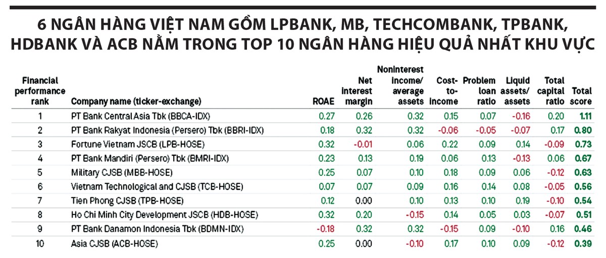 Tổng hợp các yếu tố, có tới 6 ngân hàng Việt Nam lọt vào Top 10 xếp hạng các ngân hàng hiệu quả nhất khu vực, lần lượt là LPBank, MB, Techcombank, TPBank, HDBank và ACB.