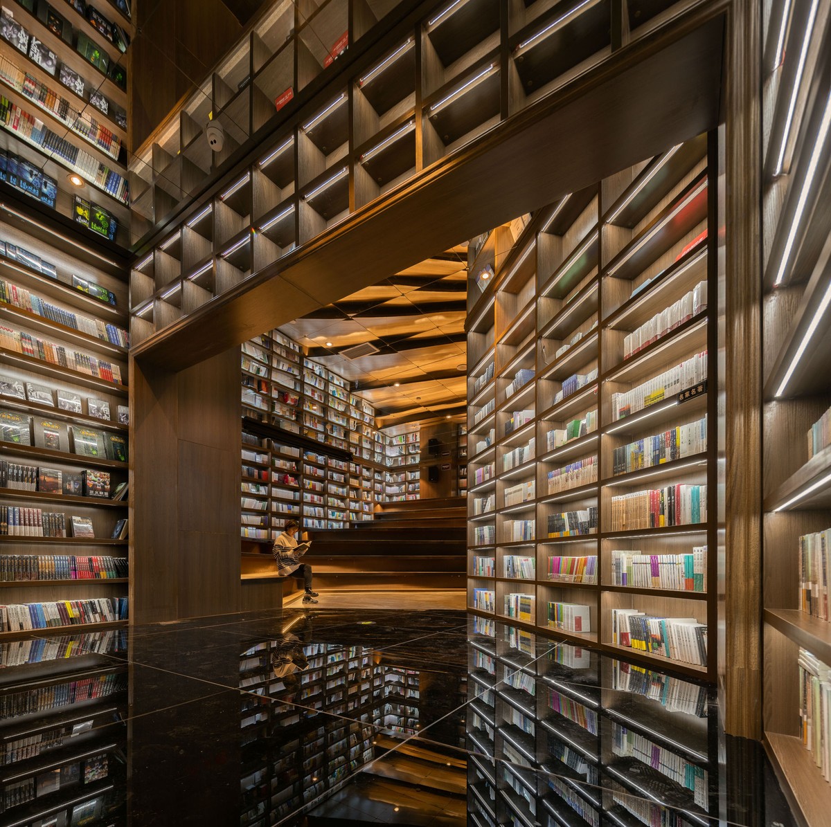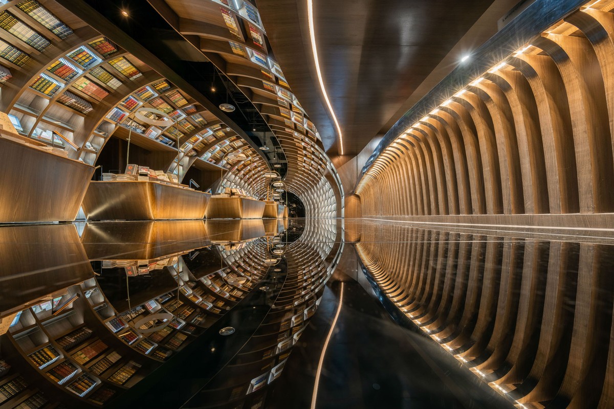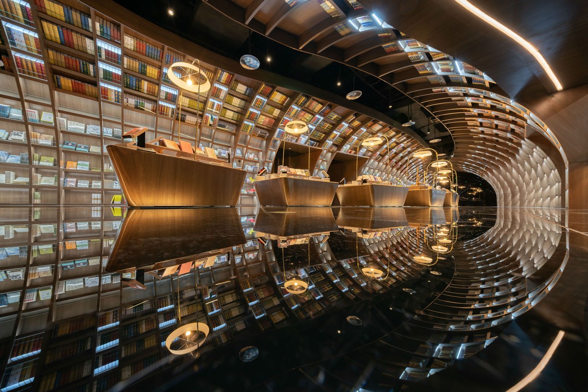 Càng bước sâu vào bên trong, “hang động” như chuyển mình mềm mại thành một dòng sông, với ánh đèn mải miết thắp sáng các khung chứa sách.