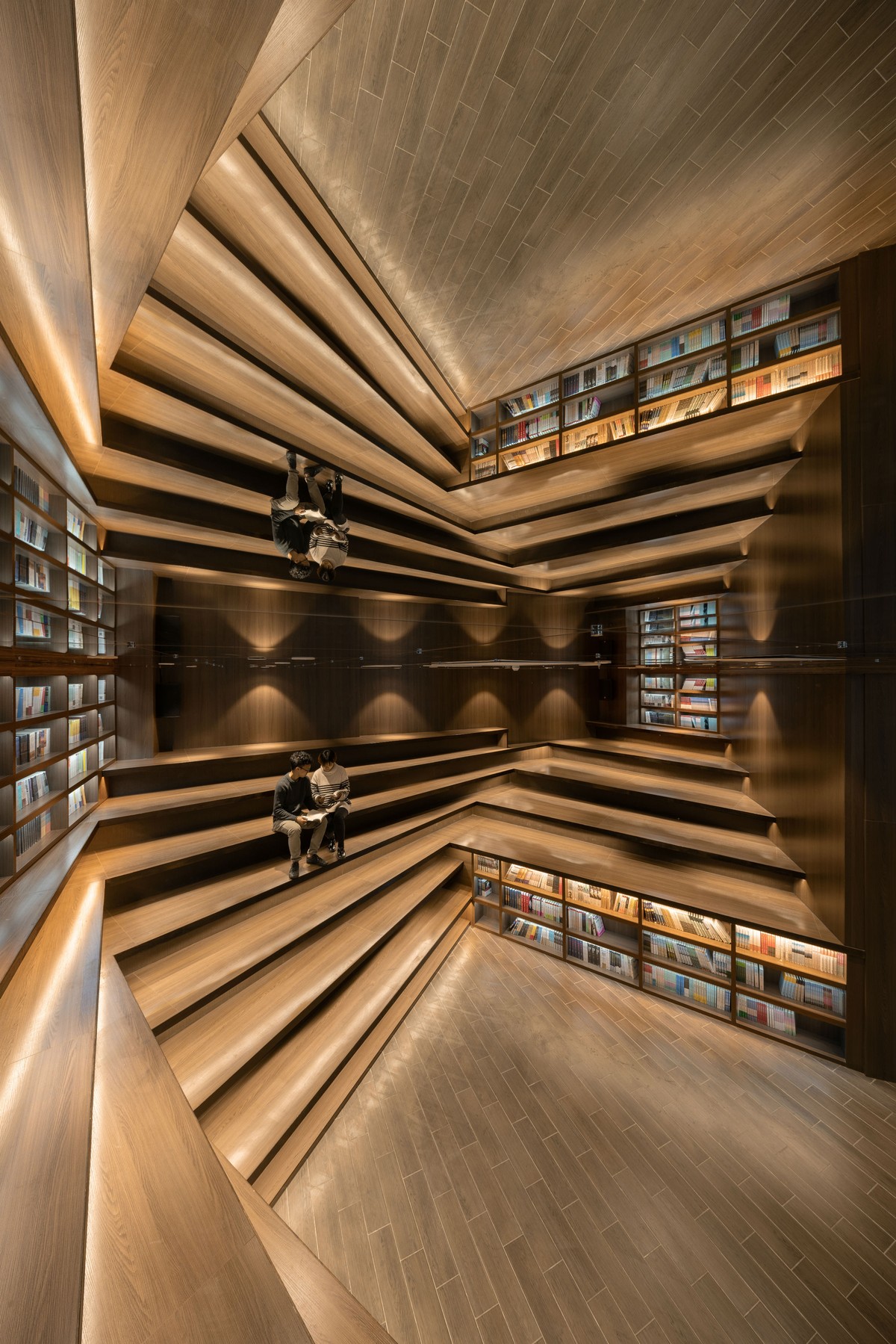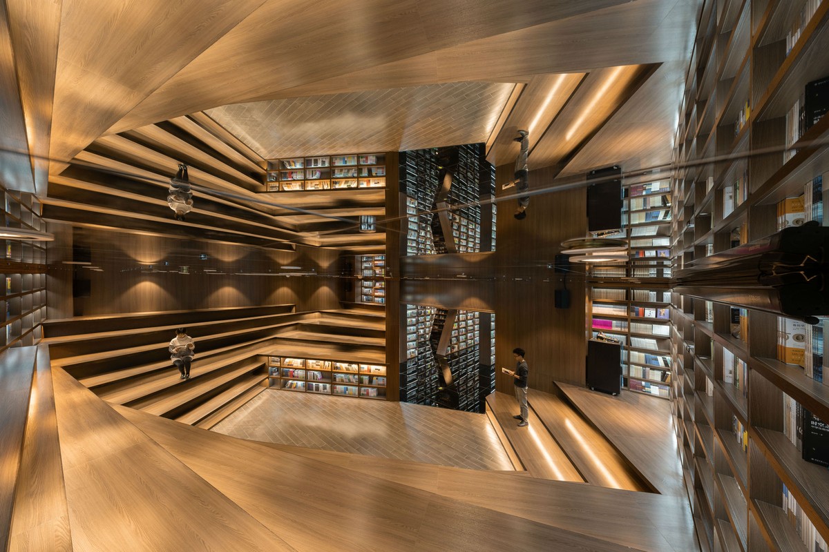 Bước qua khu vực “hang động”, là các không gian nhỏ được dành riêng cho việc đọc sách, với các giá sách trở thành tường ngăn, vừa thoáng đãng vừa ưa nhìn, đảm bảo không gian riêng tư, trong khi vẫn giữ vững tính kết nối với toàn thể cấu trúc hiệu sách.