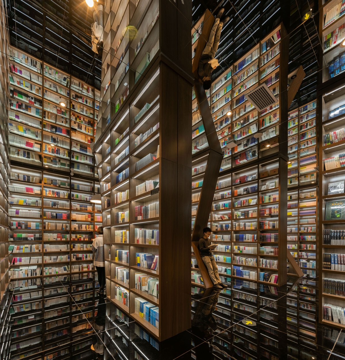 Mang dáng vẻ của một hang động đá vôi, hàng loạt các kệ sách được tạo hình như “nhũ đá” chạy thẳng từ trần nhà xuống nền đất, nổi bật trên nền kính đen