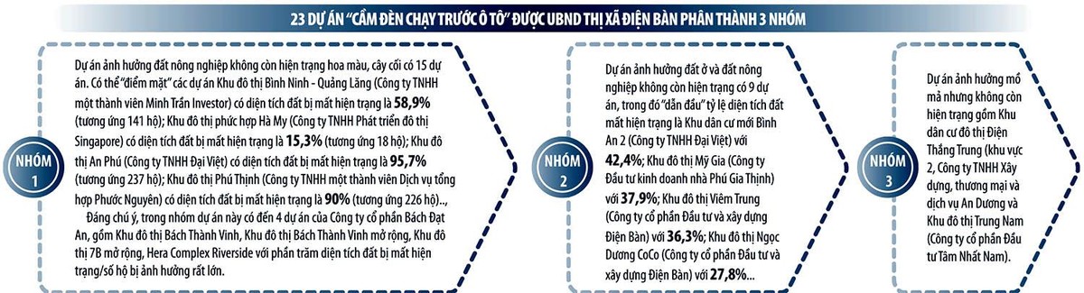 Tài liệu của phóng viên Báo Đầu tư thể hiện, đến tháng 7/2021, tại thị xã Điện Bàn có đến 23 dự án khu dân cư - đô thị mà chủ đầu tư đã chi tiền và tổ chức thi công trước khi lập phương án bồi thường, hỗ trợ, dẫn đến mất hiện trạng, ảnh hưởng đến công tác thẩm định phương án giải phóng mặt bằng.