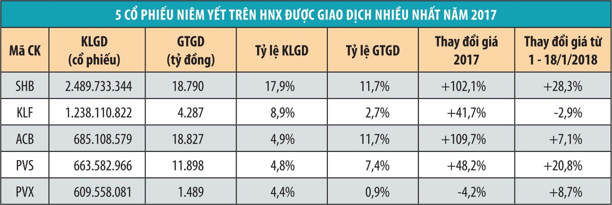 Kể từ đầu năm 2018 đến ngày 18/1, có 4/5 mã cổ phiếu nêu trên tăng giá. Cụ thể: SHB tăng 28,3%, PVS tăng 20,7%, PVX tăng 8,7%, ACB tăng 7%; 1 mã giảm giá là KLF, giảm gần 3%. Trong khoảng thời gian này, chỉ số HNX-Index tăng thêm 4,3%, đạt 121,9 điểm.
