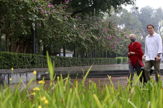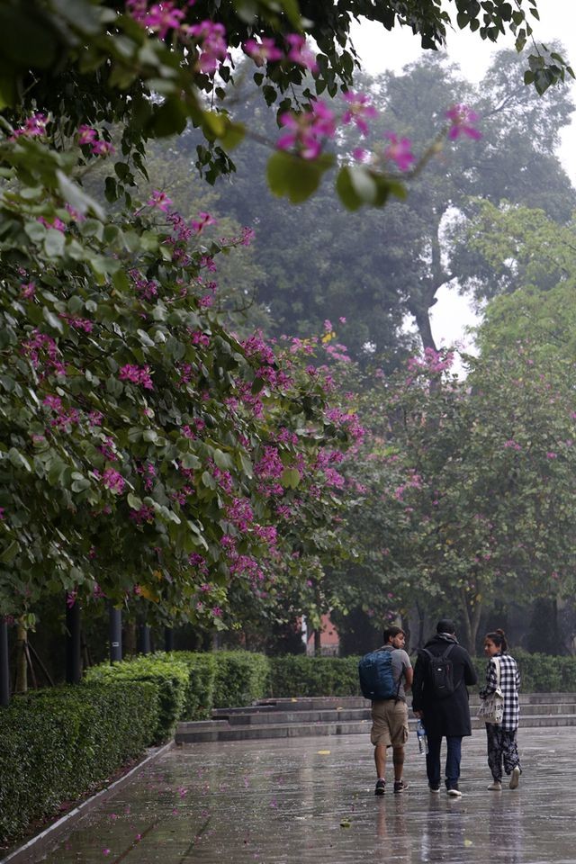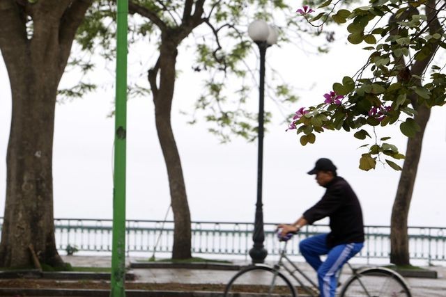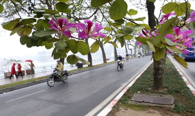 Đường Thanh Niên có nhiều cây ban đang độ nở hoa tuyệt đẹp. Cả hoa ban trắng và hoa ban tím hòa quyện trong tiết trời sương mù tạo cảnh sắc thơ mộng cho không gian Hồ Tây.
