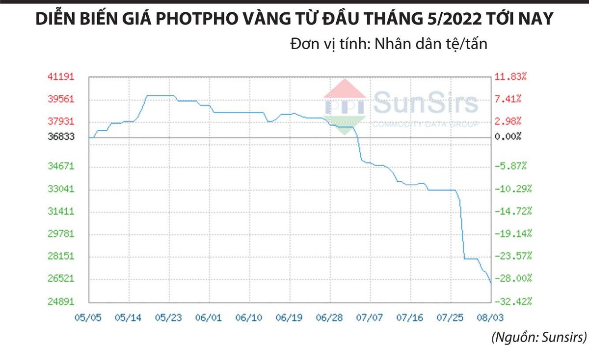 Cụ thể, biên lợi nhuận gộp của Công ty năm 2019 đạt 19,77%, năm 2020 đạt 23,72%, năm 2021 đạt 33,32% và 6 tháng đầu năm 2022 đạt 50,2%. Tuy vậy, theo dữ liệu của Sunsirs, giá phốt pho vàng tại Trung Quốc tới ngày 3/8/2022 là 26.250 Nhân dân tệ/tấn, giảm hơn 33,6% so với cuối tháng 5 và vẫn trong xu hướng giảm.