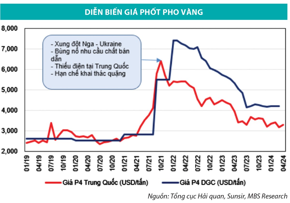 Công ty Chứng khoán MB (MBS) thông tin, giá bán phốt pho vàng bình quân trong quý I/2024 của Hóa chất Đức Giang là hơn 4.200 USD/tấn, tương đương mức giá trong quý IV/2023, nhưng tăng 3,2% so với mức thấp nhất trong tháng 7/2023.