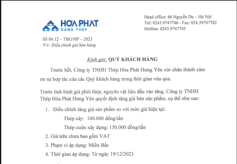 Đây là lần thứ 3 Hòa Phát - nhà sản xuất chiếm thị phần lớn nhất - tăng giá bán. Ngày 11/12, Hòa Phát đã điều chỉnh tăng giá sản phẩm so với mức hiện tại với thép cây các loại (từ D12 trở lên) lên 150.000 đồng/tấn, thép cây D10 tăng 250.000 đồng/tấn tại thị trường miền Bắc.