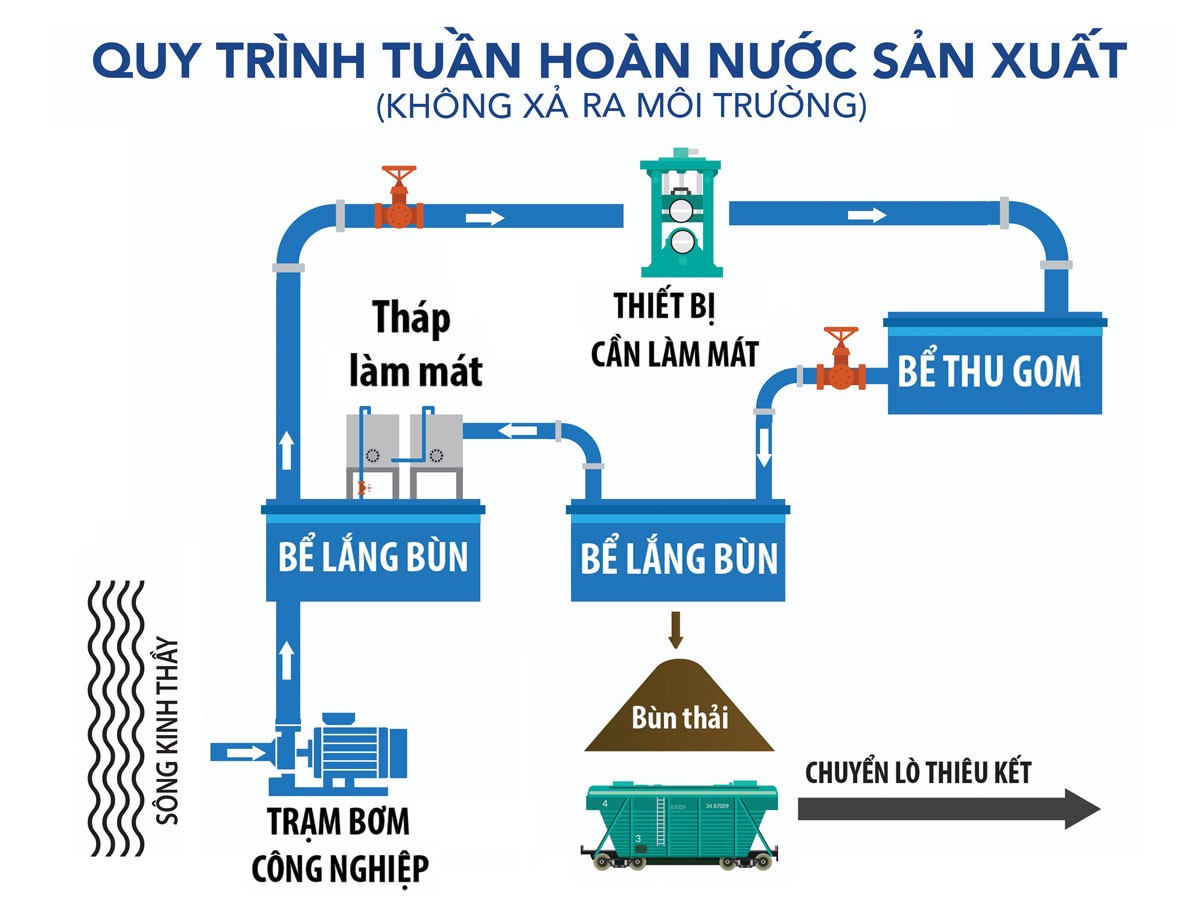 Hệ thống nước sản xuất được tái xử lý, tái sử dụng tuần hoàn 100%, không xả ra môi trường. Ngoài ra, Khu liên hợp còn xây dựng 10 bể lắng để thu gom toàn bộ nước mưa chảy tràn để lắng bụi bẩn và ngăn dầu mỡ (nếu có). Nước thải sau khi xử lý đạt chuẩn được tái sử dụng cho các công đoạn của nhà máy.