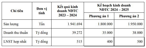 Theo đó, Hoa Sen đã đưa ra 2 kịch bản kinh doanh cho NĐTC 2024-2025. Phương án thứ nhất, HSG đặt mục tiêu sản lượng đạt 1,8 triệu tấn, doanh thu thuần 35.000 tỷ đồng và lợi nhuận sau thuế hợp nhất 400 tỷ đồng. Với phương án thứ hai, HSG đặt mục tiêu sản lượng 1,95 triệu tấn, doanh thu thuần 38.000 tỷ đồng và lợi nhuận sau thuế 500 tỷ đồng.
