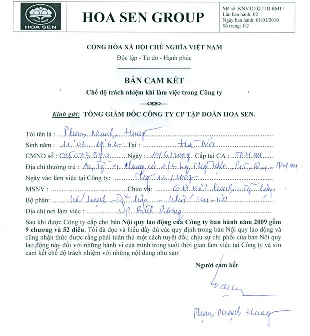 Bản cam kết của ông Phạm Mạnh Hùng, từng giữ chức vụ Phó giám đốc kế hoạch sản xuất và cung ứng của Hoa Sen, người cũng đang làm việc cho Thép Nam Kim