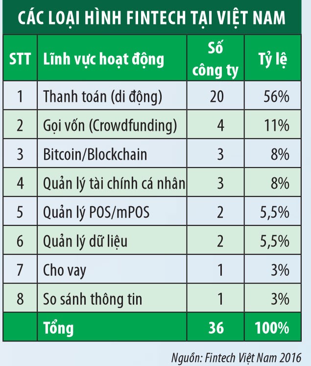 Tại Việt Nam, lĩnh vực Fintech còn khá mới mẻ với khoảng 36 công ty hoạt động trong lĩnh vực này, trong đó phần lớn tập trung vào mảng thanh toán. Hiện có hơn một nửa các doanh nghiệp khởi nghiệp Fintech ở Việt Nam đang cung cấp cho người tiêu dùng công cụ thanh toán trực tuyến (như Moca, Payoo, VinaPay, MoMo...), hoặc cung ứng giải pháp thanh toán kỹ thuật số POS/mPOS.
