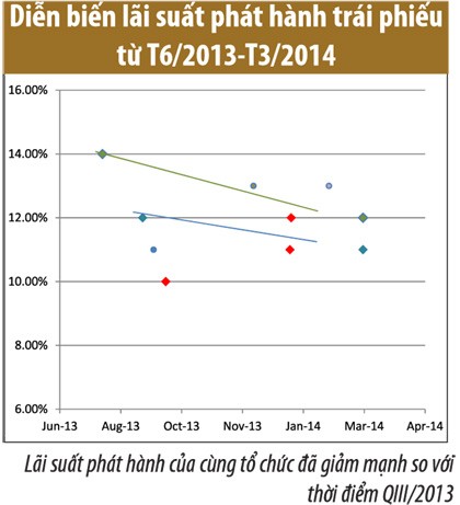 Một loạt đợt phát hành trái phiếu đã và đang chuẩn bị phát hành từ đầu năm tới nay cũng đưa ra các mức lãi suất giảm đáng kể. Lãi suất đợt phát hành trái phiếu của CTCP Đầu tư Phát triển hạ tầng kỹ thuật (Becamex) vào tháng 1/2014 đã xuống mức 12%/năm, biên lãi suất 4%/năm. Đợt phát hành trái phiếu đang thực hiện của một công ty thuộc Masan Group có lãi suất giảm 100 điểm so với đợt phát hành của công ty mẹ hồi quý III/2014, xuống mức lãi suất dự kiến 11%/năm cho kỳ đầu tiên, biên 4%/năm cho các kỳ tiếp theo.