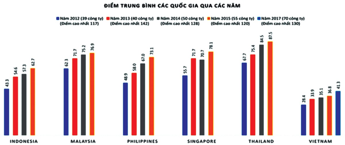 Theo ACGS, mặc dù có tiến bộ qua từng năm nhưng điểm trung bình về QTCT của Việt Nam vẫn còn một khoảng cách khá xa so với các nước trong khu vực, đặc biệt là Thái Lan và Singapore (xem biểu đồ 1).