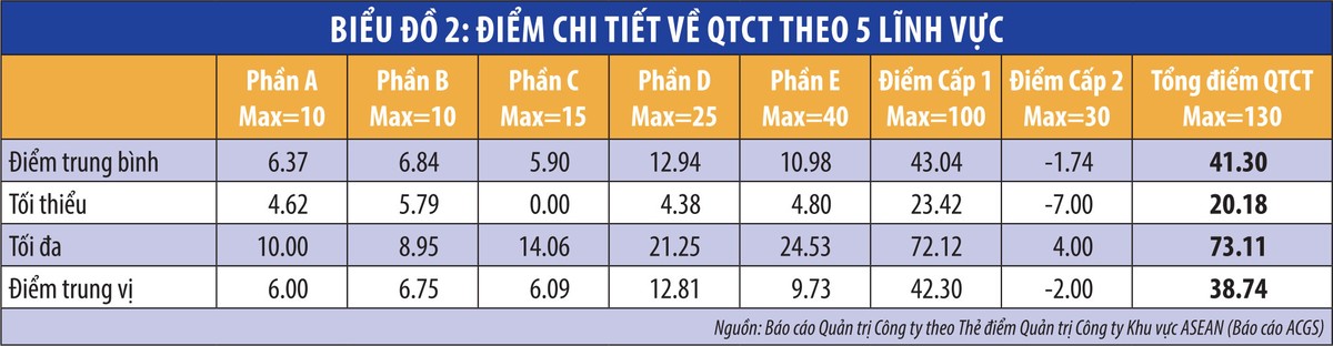 Nhận định trên hoàn toàn phù hợp với kết quả của thẻ điểm quản trị công ty ASEAN (ACGS) mà Việt Nam đã tham gia trong những năm vừa qua. Trong báo cáo đánh giá QTCT các doanh nghiệp niêm yết tại Việt Nam năm 2018, mặc dù không áp dụng toàn bộ các câu hỏi như đánh giá của ACGS, điểm tối đa của các doanh nghiệp niêm yết chỉ đạt 75 điểm (trên tổng số tối đa 104 điểm).