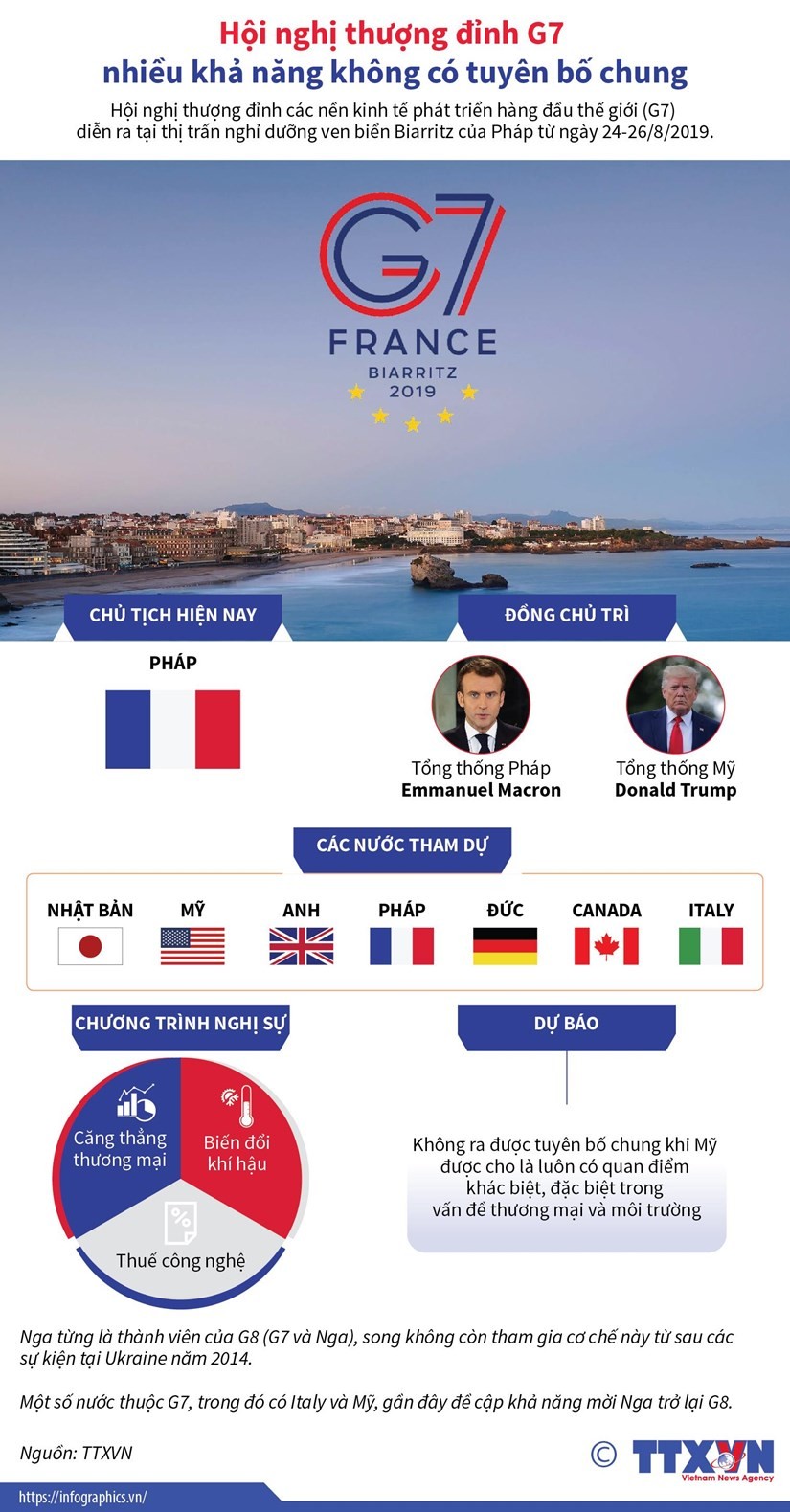 Theo TTXVN Chia sẻ Chia sẻ Tin liên quan Ông Trump rút khỏi Tuyên bố chung G7 10/06/2018 16:24 Ông Trump muốn Nga gia nhập G7 21/08/2019 09:34 Tổng thống Pháp Macron: Nga trở lại G7 phụ thuộc vào tình hình ở Ukraine 21/08/2019 18:42 Lãnh đạo G7 sẽ gây sức ép với Mỹ về vấn đề thuế nhập khẩu 08/06/2018 08:42 Từ khóa G7 Thị Trấn Nghỉ Dưỡng Tổng Thống Pháp Emmanuel Macron Toàn Cầu Hóa