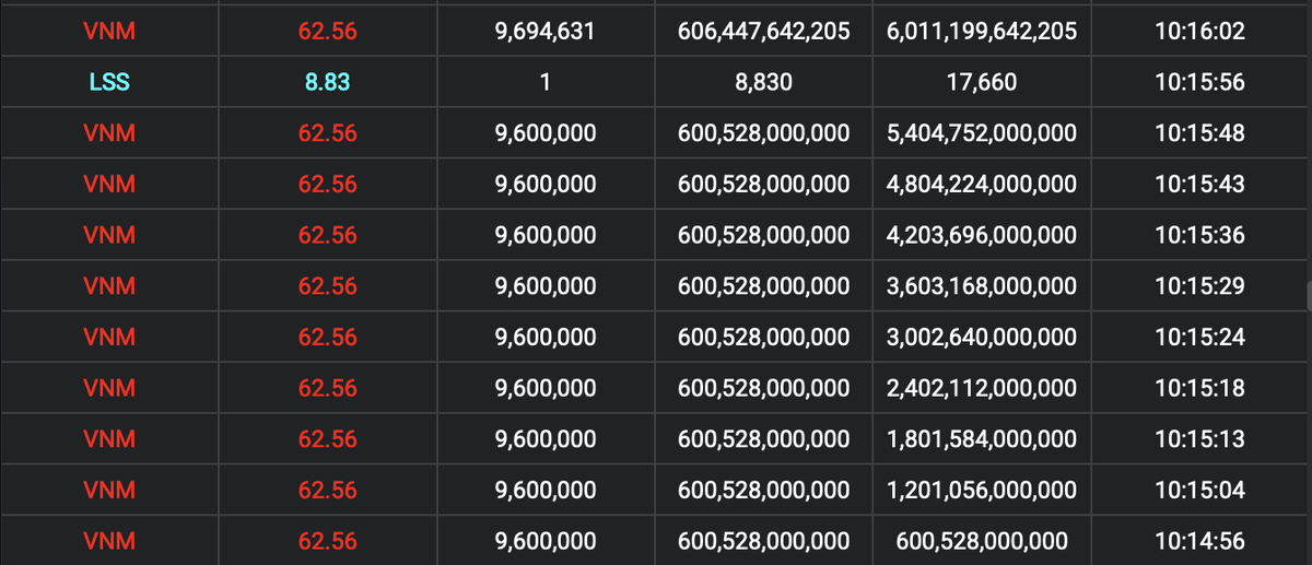 (ĐTCK) Chỉ trong vòng 2 phút phiên sáng 22/12 (từ 10h14 đến 10h16), hơn 96 triệu cổ phiếu VNM của CTCP Sữa Việt Nam (Vinamilk, mã VNM) đã được giao dịch thoả thuận thành công với giá 62.560 đồng/CP, tương ứng tổng giá trị hơn 6.011 tỷ đồng.