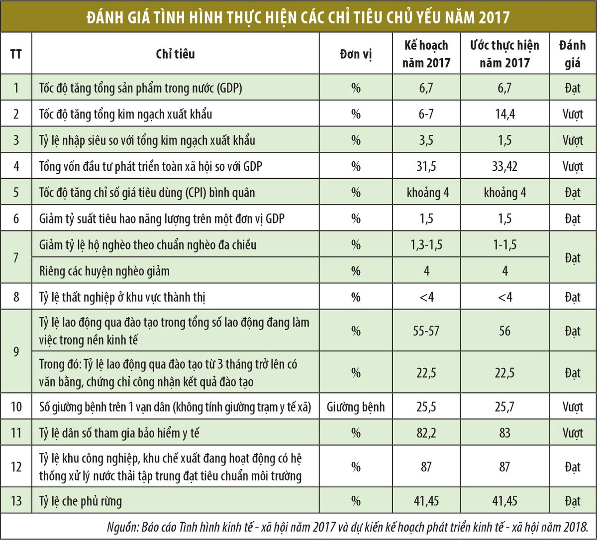Báo cáo về tình hình phát triển kinh tế - xã hội 9 tháng đầu năm 2017 và dự báo năm 2017, Bộ trưởng Bộ Kế hoạch và Đầu tư Nguyễn Chí Dũng nhấn mạnh: “Kết quả nổi bật nhất năm 2017 là duy trì ổn định kinh tế vĩ mô, tăng trưởng kinh tế chuyển biến tích cực, có bước đột phá, quý sau cao hơn quý trước với khoảng cách lớn và trên đà hướng tới hoàn thành mục tiêu tăng trưởng GDP 6,7% của cả năm 2017”.