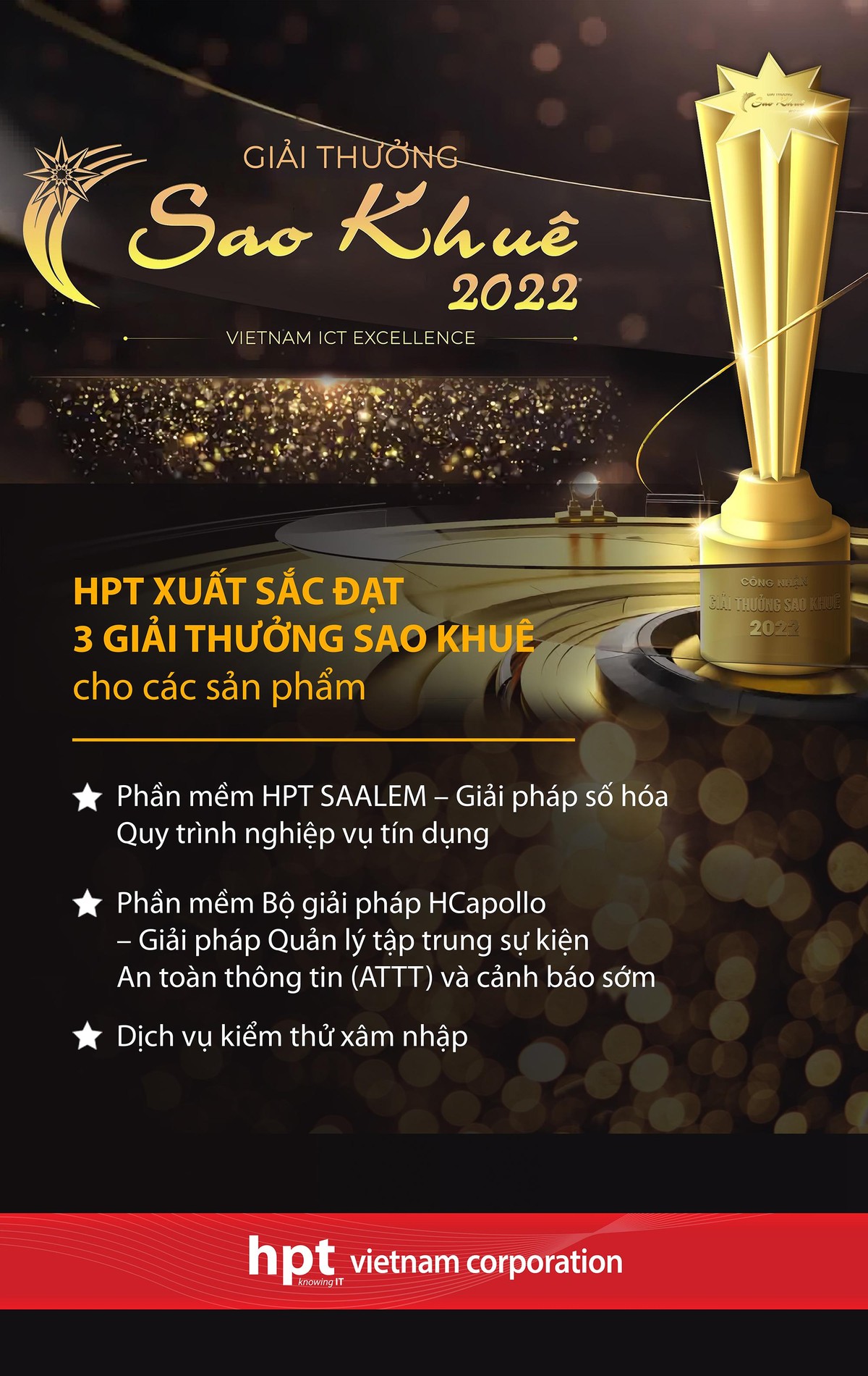 Trong đó, 3 sản phẩm và dịch vụ đã xuất sắc đạt giải Sao Khuê do Hiệp hội phần mềm và dịch vụ CNTT Việt Nam (VINASA) bình chọn gồm: Phần mềm Bộ giải pháp HCapollo – Giải pháp Quản lý tập trung sự kiện an toàn thông tin và cảnh báo sớm, Phần mềm HPT SAALEM - Giải pháp số hóa Quy trình nghiệp vụ tín dụng, Dịch vụ kiểm thử xâm nhập.