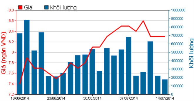 Biểu đồ giao dịch, khối lượng của mã HQC trong 1 tháng qua. Nguồn: HOSE