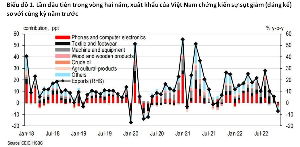 Rõ ràng, theo HSBC, nguyên nhân chính đến từ lĩnh vực điện tử vốn chiếm khoảng 35% tổng kim ngạch xuất khẩu của Việt Nam. Đơn hàng điện tử mới trên thế giới đã bắt đầu giảm mạnh từ nửa cuối năm 2022, ảnh hưởng đến lĩnh vực điện tử tiêu dùng nhiều hơn là sản phẩm công nghiệp. Tác động xảy ra trên diện rộng tại ba điểm đến chính của xuất khẩu Việt Nam là Mỹ, Trung Quốc đại lục và châu Âu. Mặc dù vậy, các lĩnh vực xuất khẩu khác của Việt Nam lại có xu hướng bị ảnh hưởng bởi suy thoái kinh tế đặc biệt là ở Mỹ.